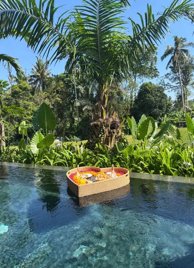 Set within the perfect location, Kaamala Resort is the ideal spot for culture and tranquillity, allowing you to easily explore the temples and markets, while being cocooned in the beauty of nature — It provides you with the best of both worlds. Staying in the Grand One Bedroom Private Pool Villa, you’re welcomed by an outdoor kitchen and pool area, featuring sun loungers, a hammock, and a dining area. Leading into the resort room with a generous king-size bed, sat beside a private jacuzzi decorated in vibrant Balinese flowers. My favourite moment was waking up to a floating breakfast in my private pool villa, with the occasional greeting from monkeys, taking in the incredible views and enjoying fresh fruit and pastries. I experienced a rare kind of privacy here, making Kaamala Resort one of the most unforgettable unique hotels in Bali for me.